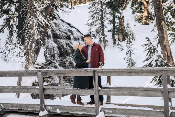 If you want a session that's a little bit snowy... I highly recommend going to this area. Mt. Hood snows around the start of January until mid March and it's the perfect place to kick off the new year with a session. It's pretty easy to get to this hidden trail right next to the Mt. Hood Meadows ski resort. The hike is an effortless 10 minutes to get to and offers a cute little bridge next to the waterfall. I have also been here during the warmer months and the location is good for anytime of year.